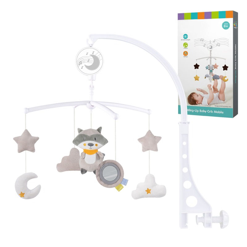 Contiene un colgante de felpa suave el cual es movible. Incluye un mapache de juguete, nube, sol, luna y estrella. Es de facil instalacion ya que no cuenta con la necesidad de colocar tornillos